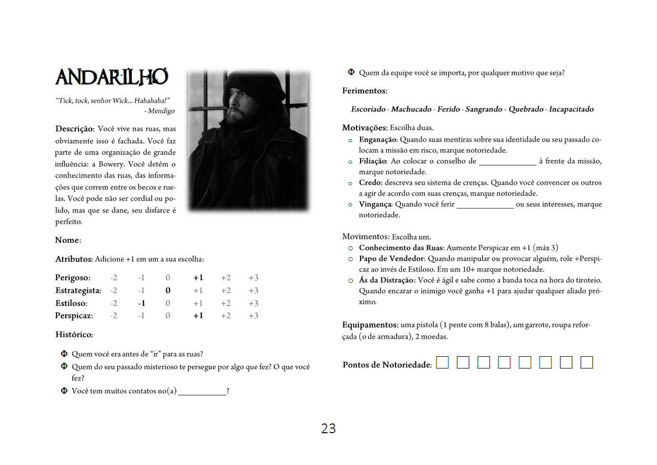 - Andarilho: Você vive nas ruas, mas isso é só fachada, pois faz parte de uma organização de grande influência: a Bowery. Você possui o conhecimento que corre entre becos e ruelas;