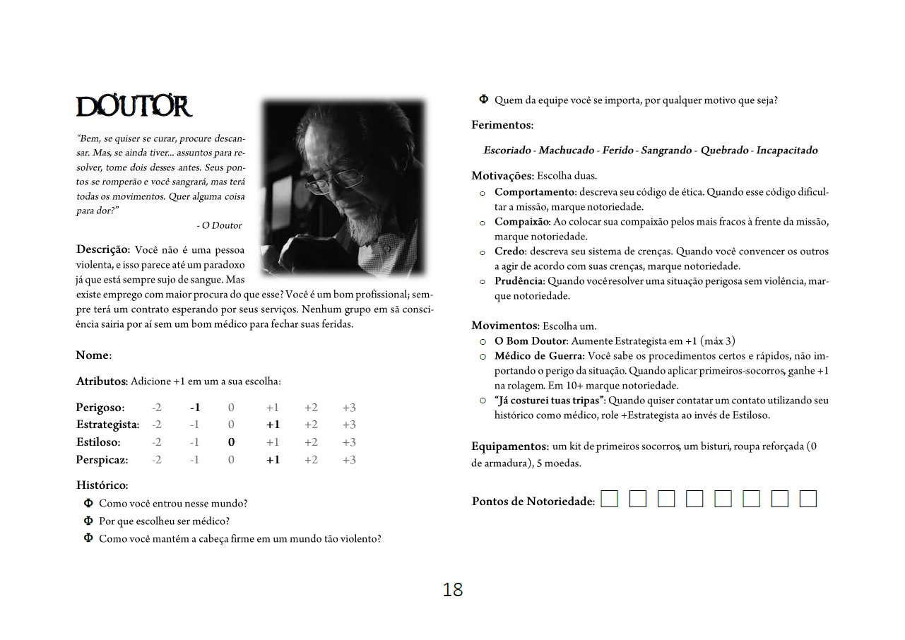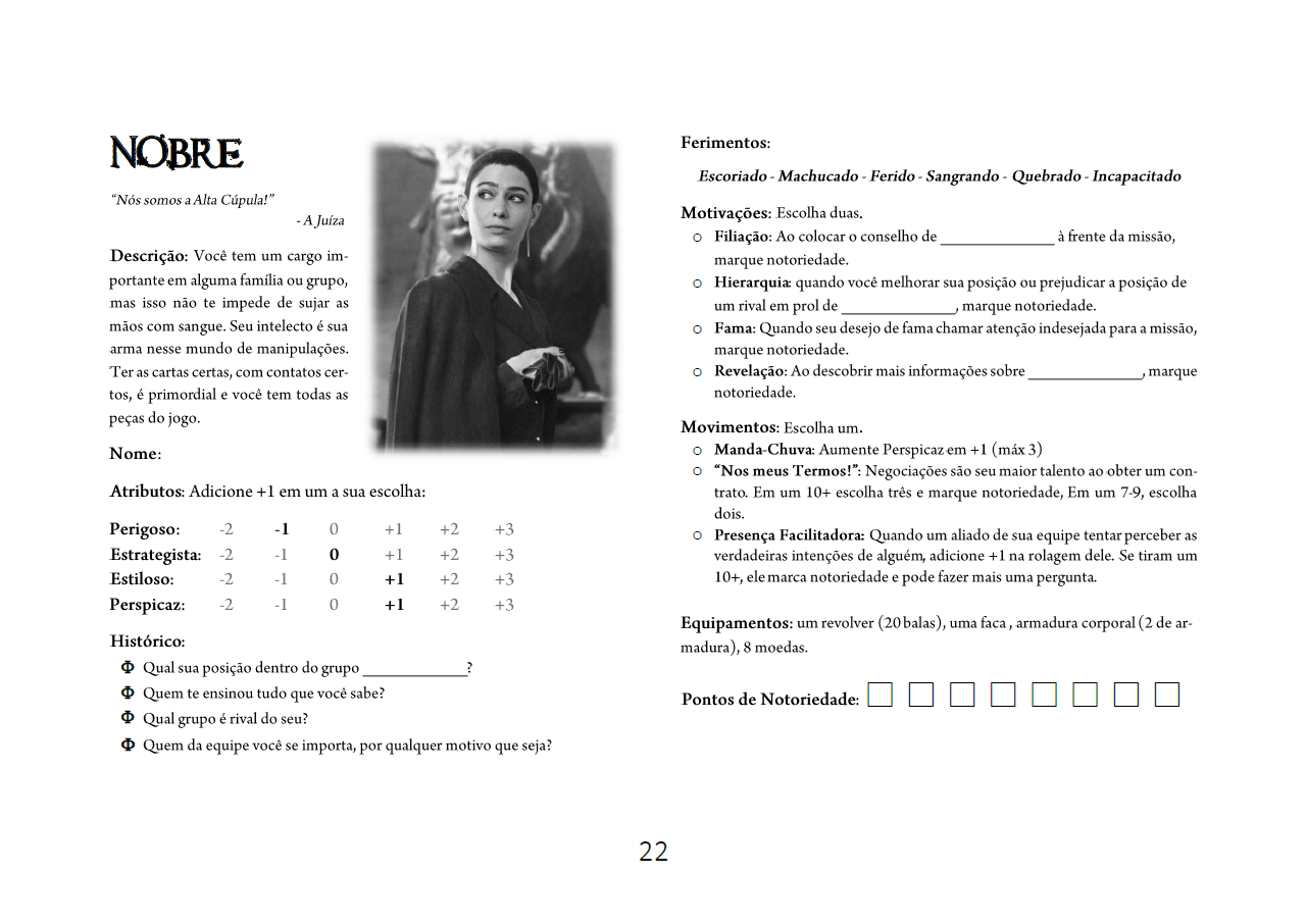 - Nobre : Você possui uma carga importante em alguma organização ou família. Isso não lhe impedirá de sujar suas mãos de sangue, mas seu intelecto é sua principal arma nesse mundo de manipulações;