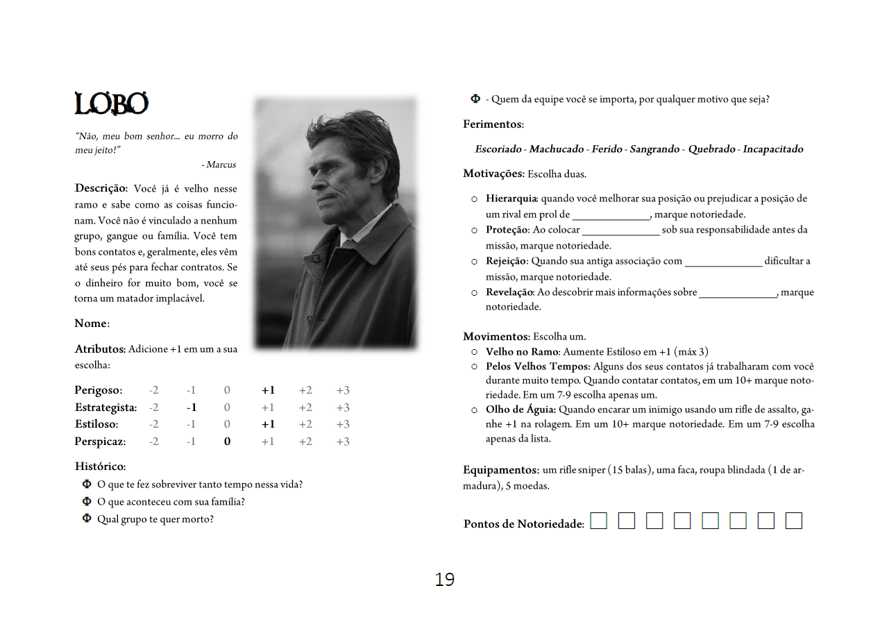 - Lobo: Você já é velho nesse ramo e sabe como as coisas funcionam. Não está vinculado a nenhum grupo, gangue ou família, mas muitos lhe procuram. E se o dinheiro for muito bom, você se torna um matador implacável;